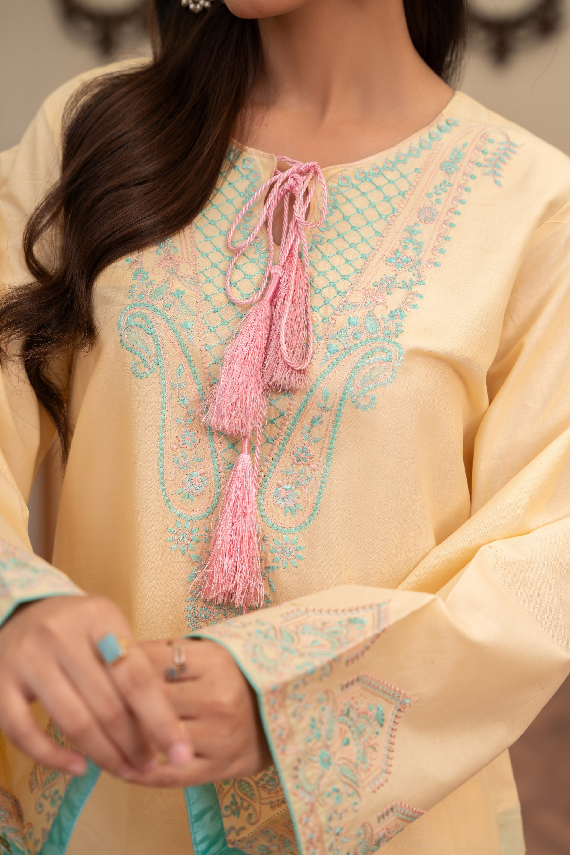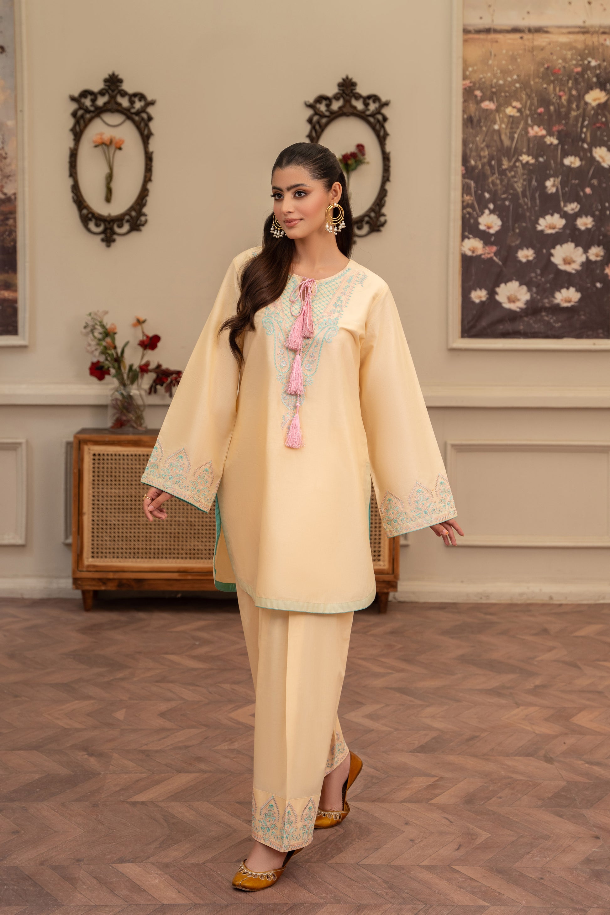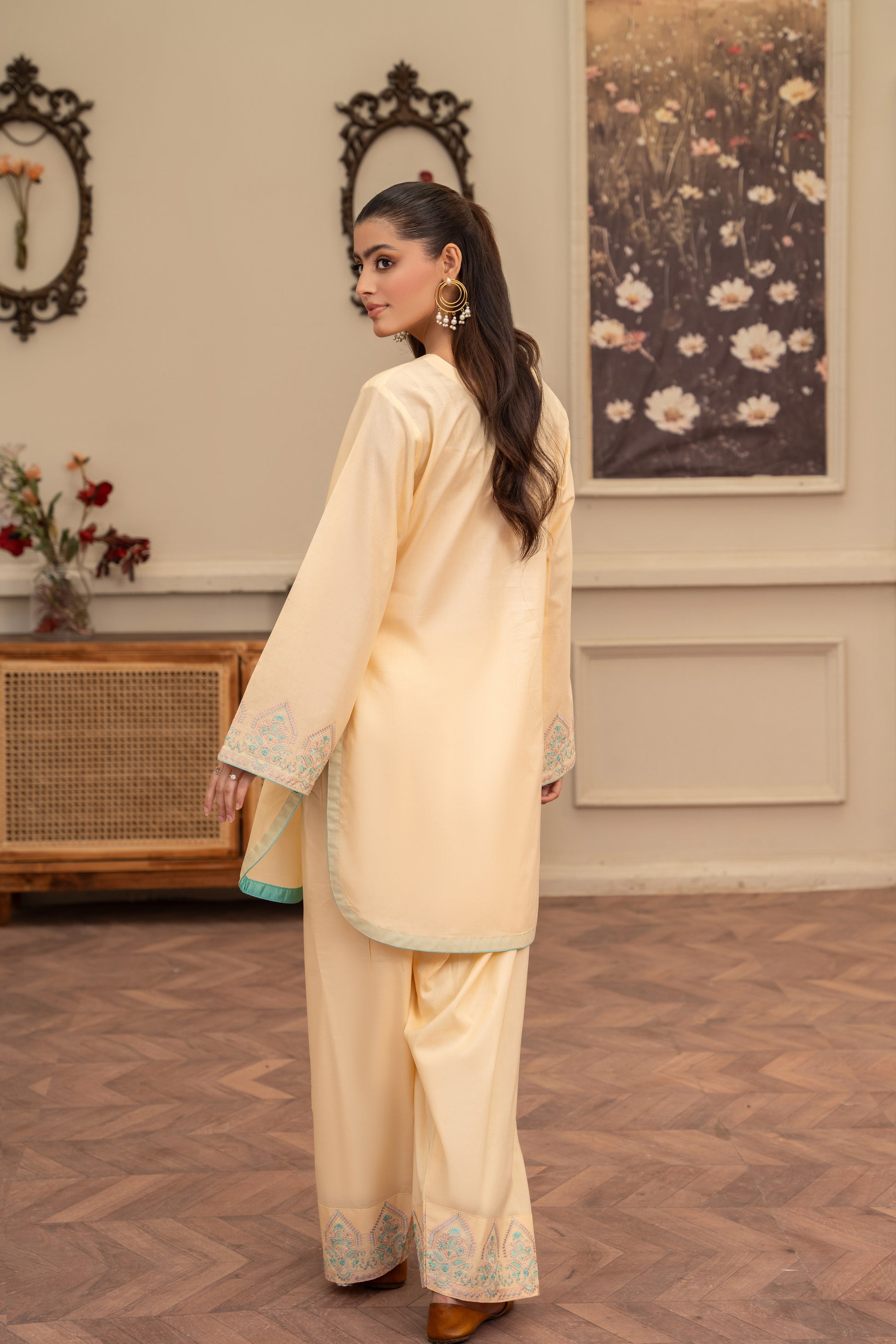 This fawn ensemble is adorned with intricate embroidery across the shirt, sleeves, and trouser, creating a harmonious and refined look. The richly detailed patterns add depth, while the elegant craftsmanship exudes timeless sophistication.
