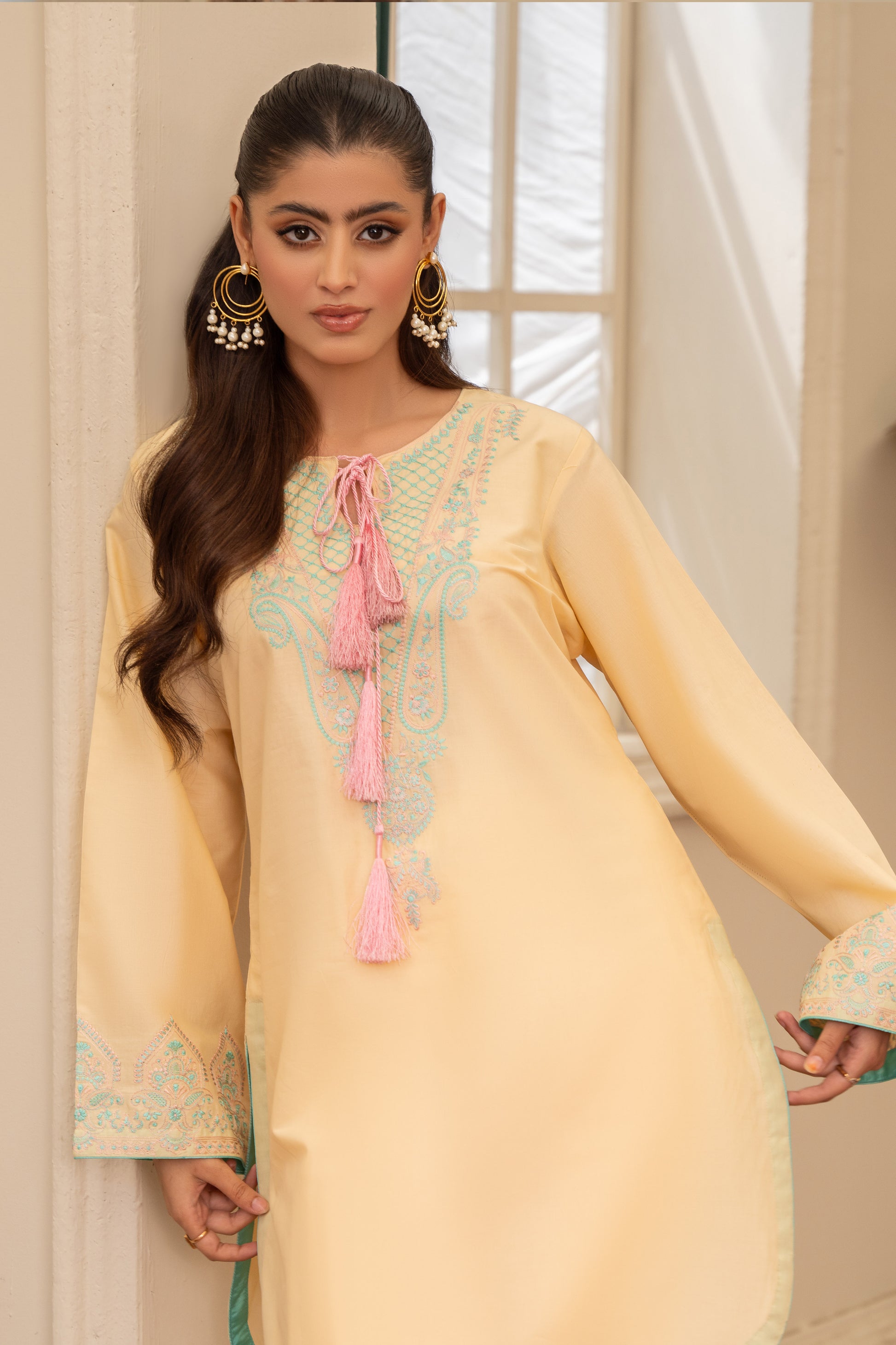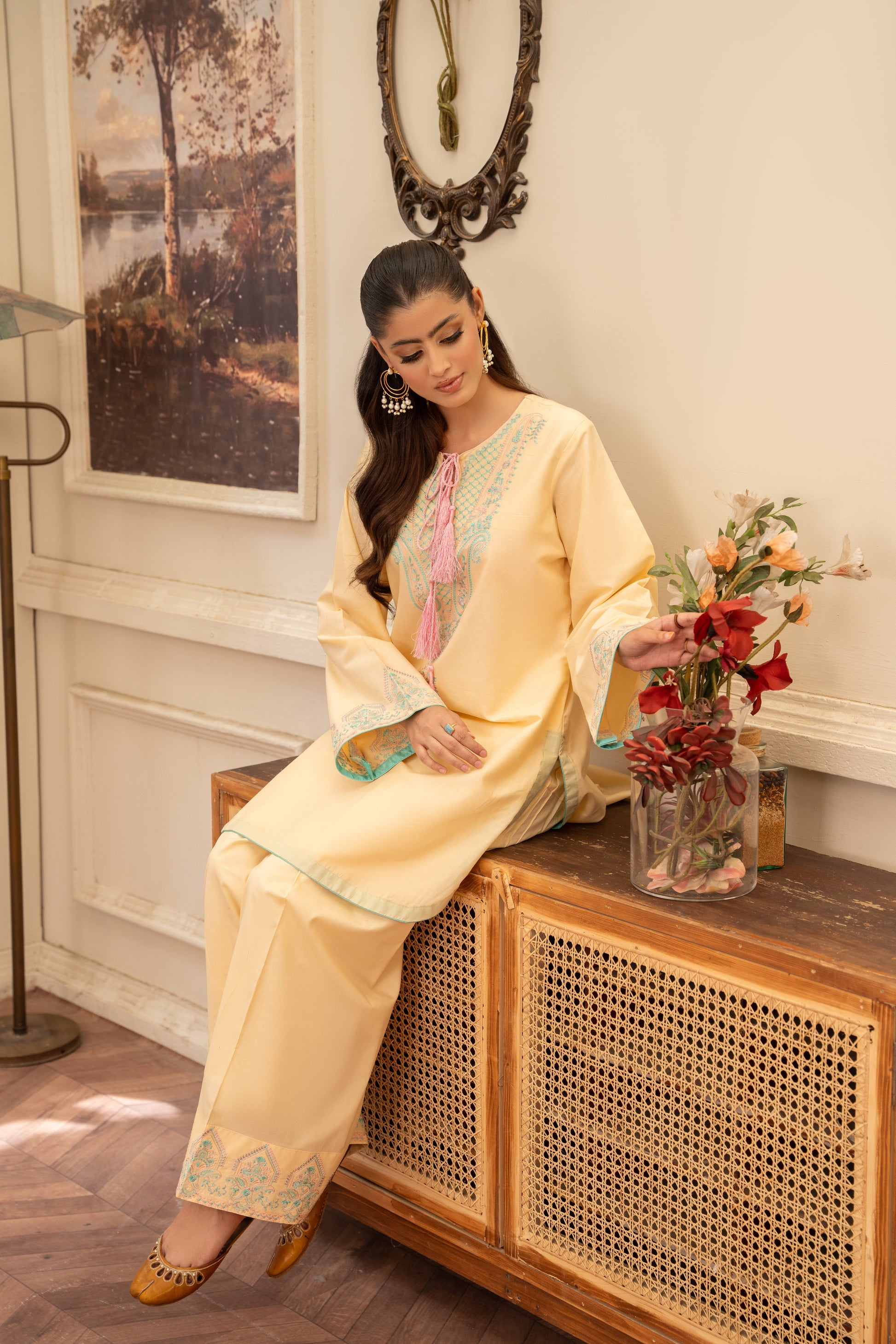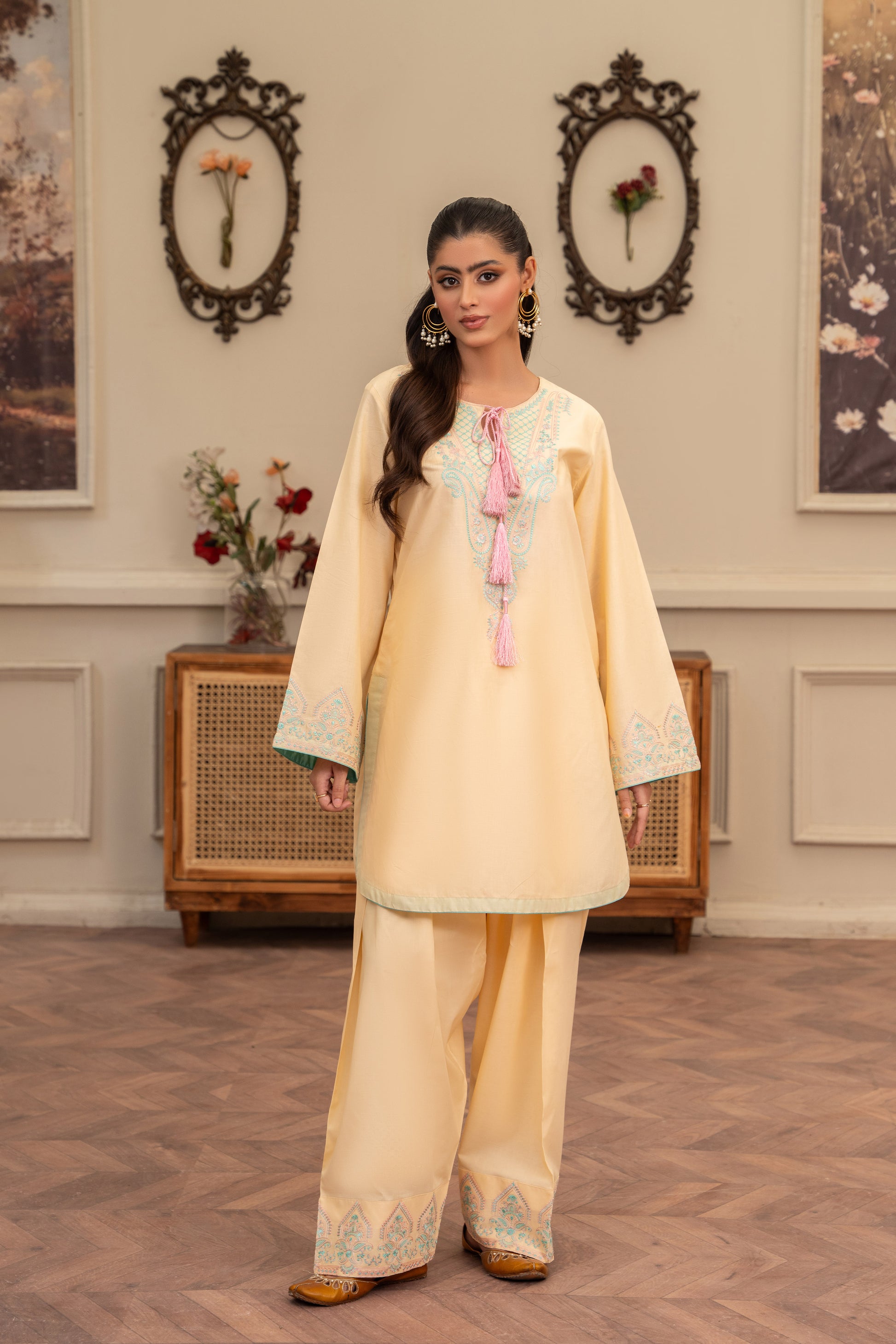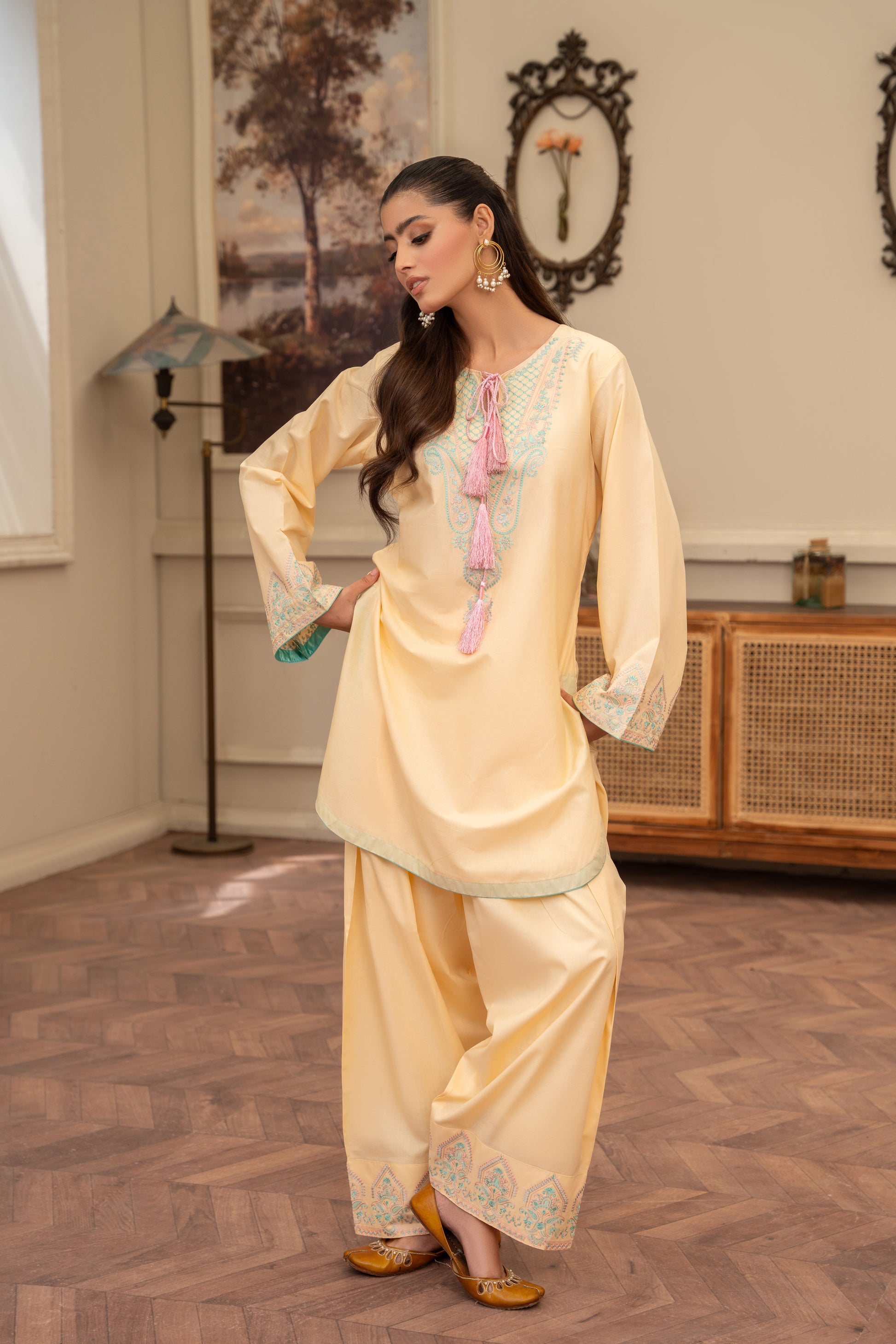 This fawn ensemble is adorned with intricate embroidery across the shirt, sleeves, and trouser, creating a harmonious and refined look. The richly detailed patterns add depth, while the elegant craftsmanship exudes timeless sophistication.