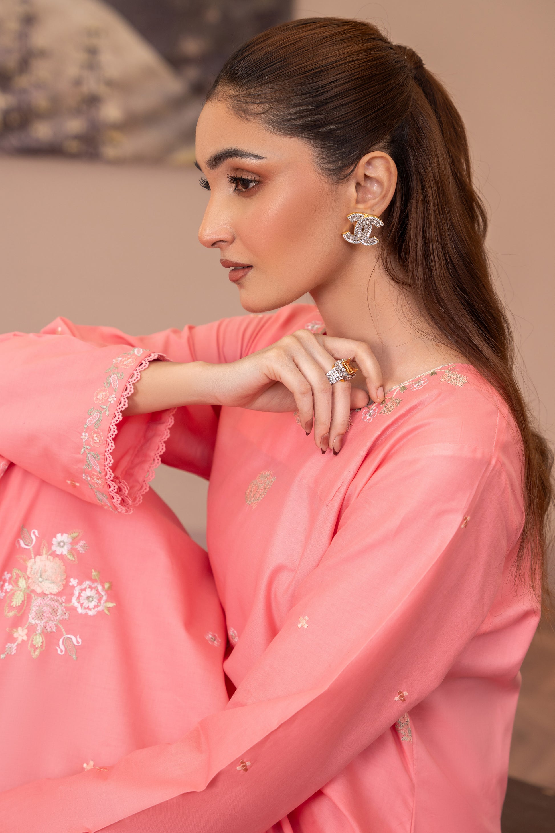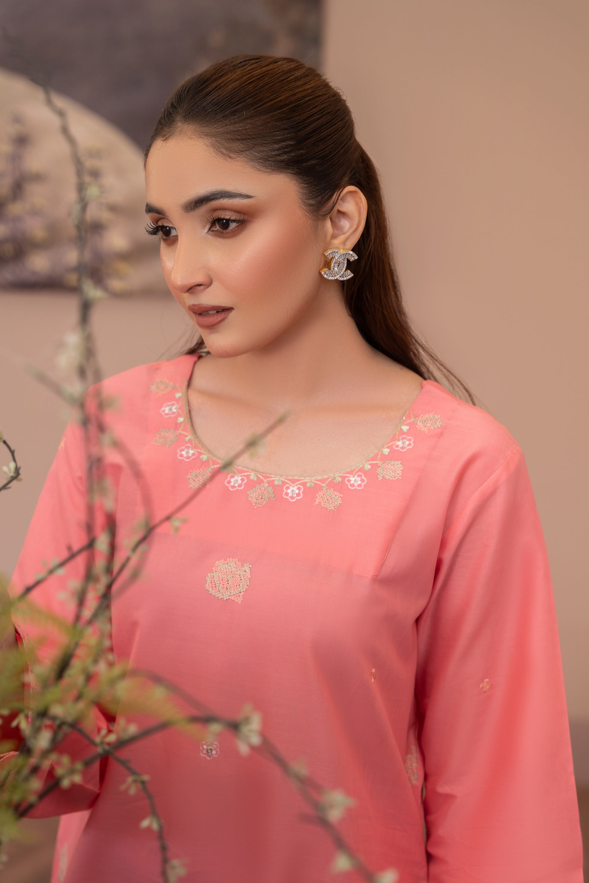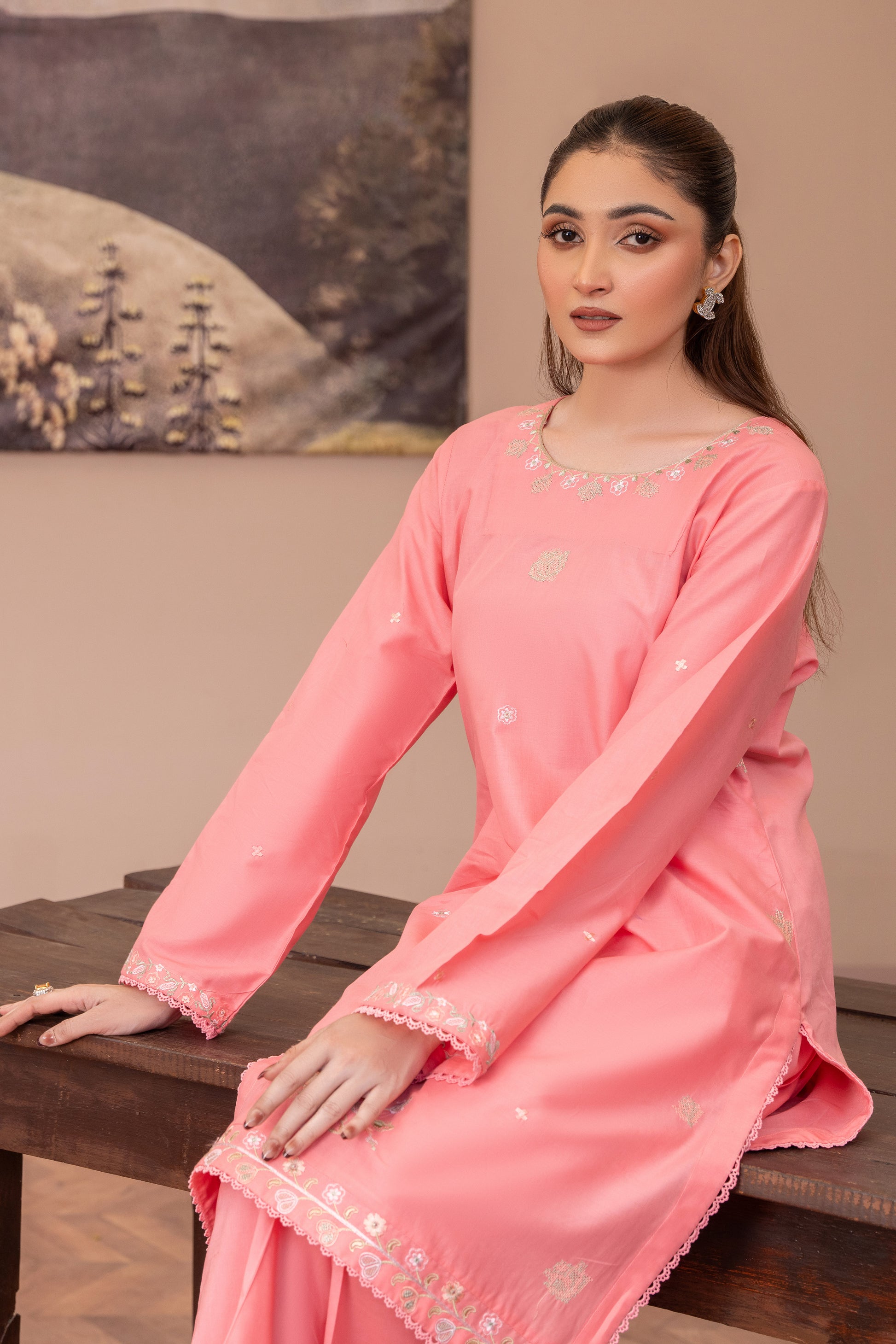 This Light Coral ensemble showcases delicate all-over embroidery, bringing depth and elegance to the design, while the embroidered sleeves lend a graceful and refined charm.