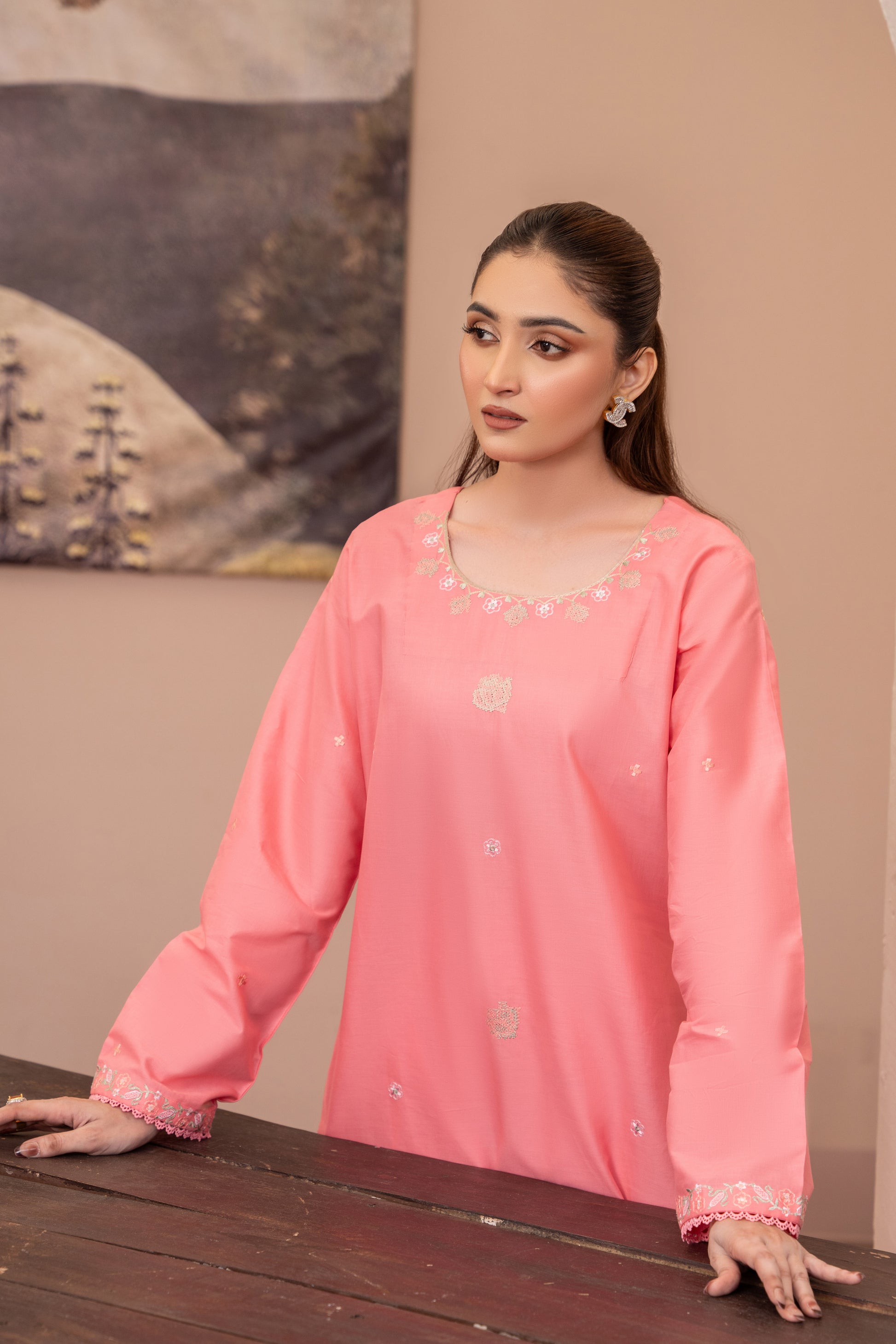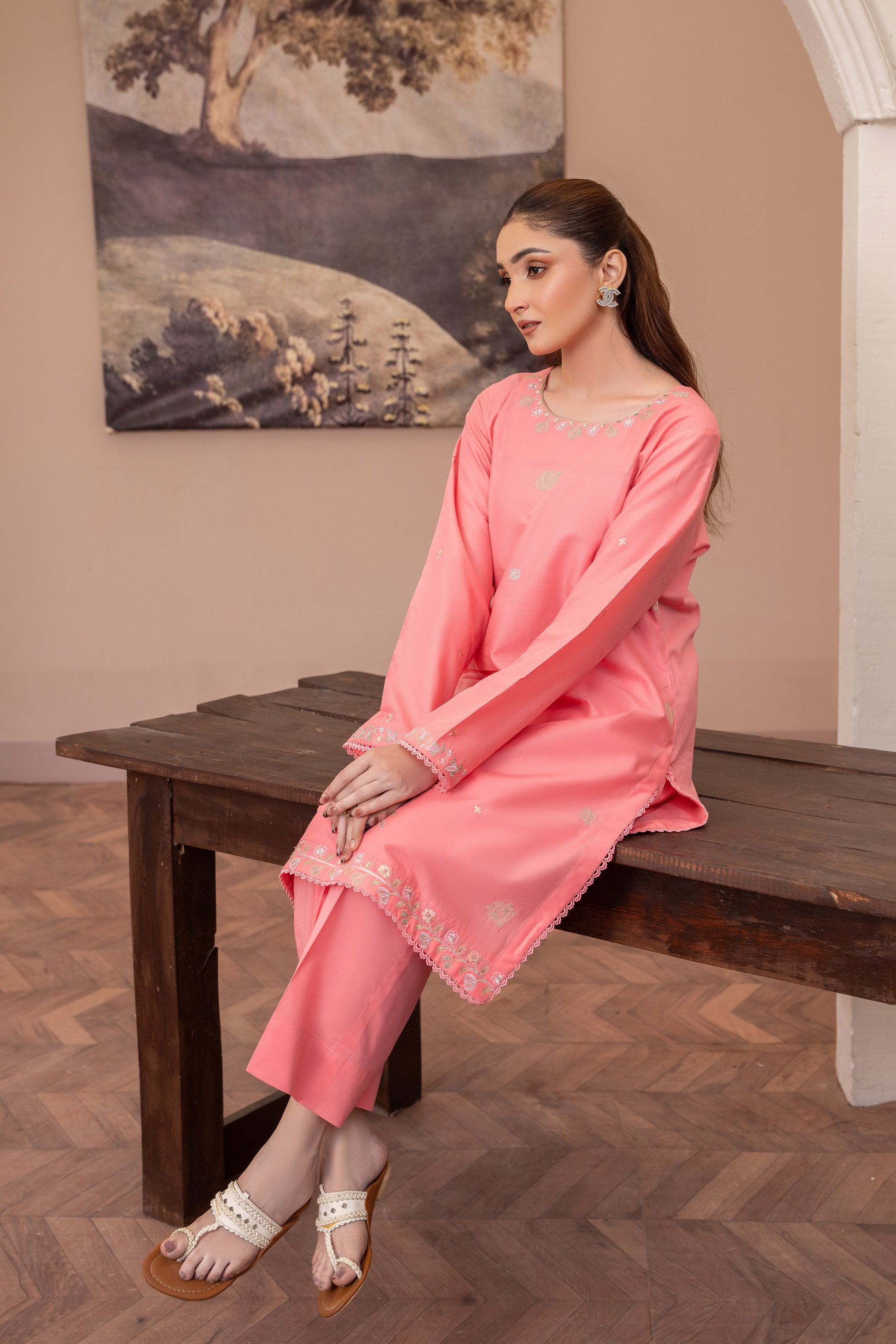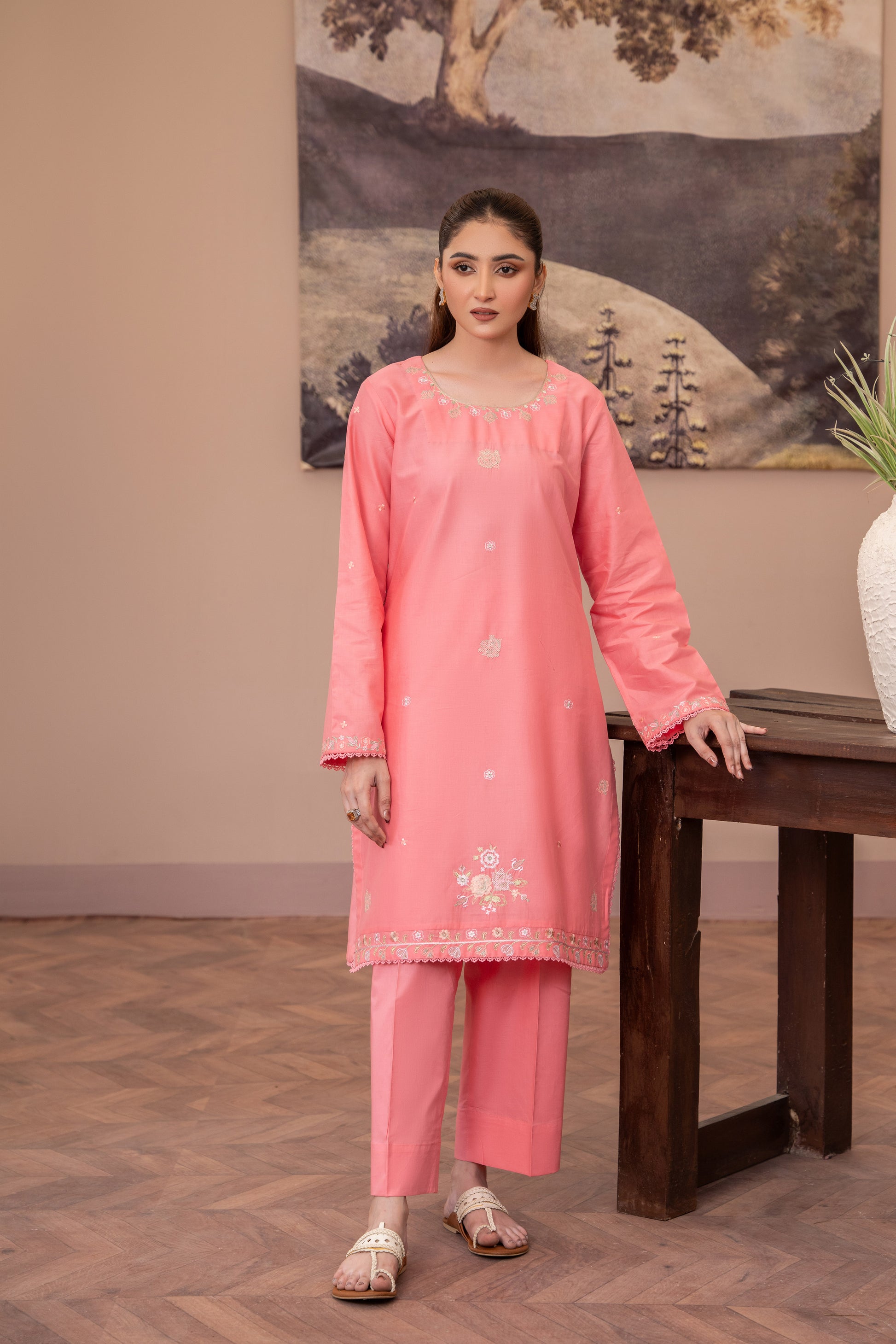 This Light Coral ensemble showcases delicate all-over embroidery, bringing depth and elegance to the design, while the embroidered sleeves lend a graceful and refined charm.